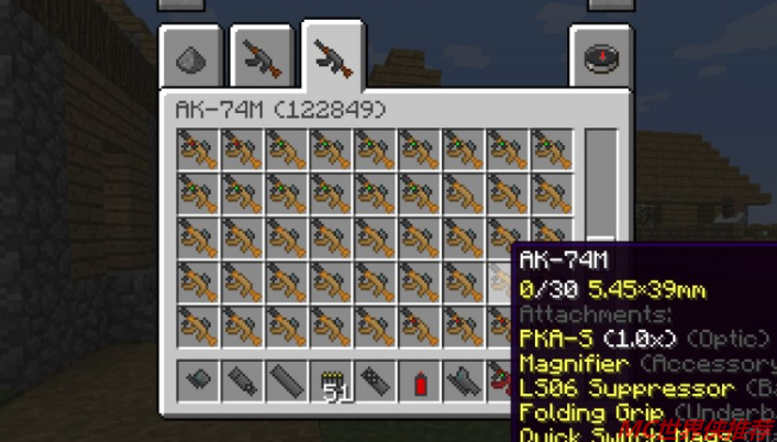 - 配件:可以与村民交易获取或合成(V2),包含瞄准镜、握把、枪管、颜色涂装等。