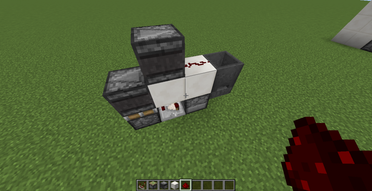 第三步:放上下半砖,在半砖后方放一个朝着半砖的发射器: