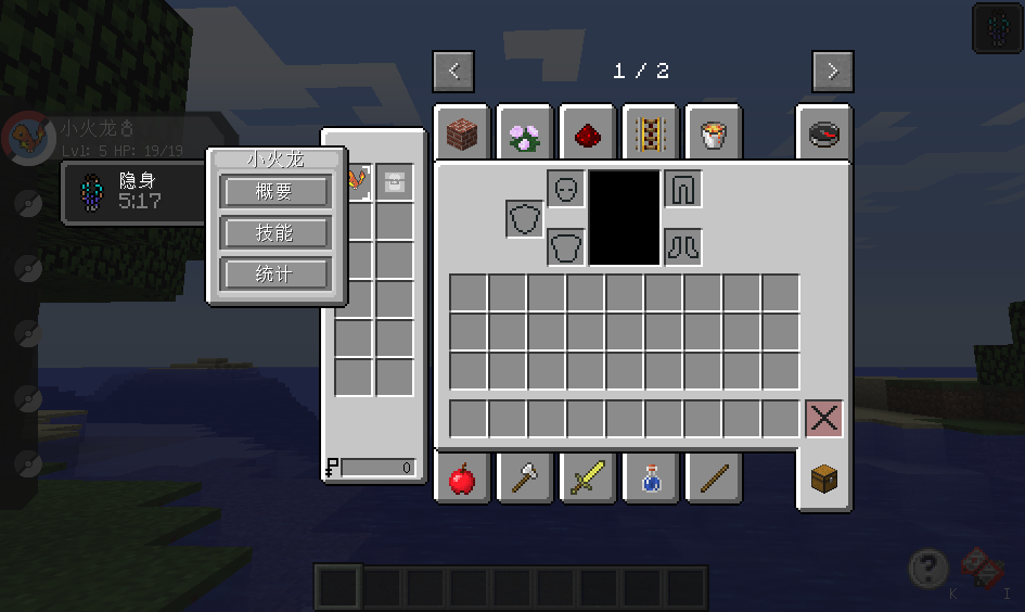 或者你也可以按‘E’键打开物品栏,你便可以看到左边的口袋妖怪对着任意一只口袋妖怪右键点击‘概要/技能/统计’3个任选一个即可.(可以看到‘口袋妖怪’旁边还有一个像‘包裹’一样的格子;用于放置道具.而‘口袋妖怪’最下方的有个类似钱的图标的为‘金钱’通过击杀训练师或者口袋妖怪获得,用于在商店购买道具或者宝石.)