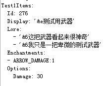Display: '&e测试用武器' (物品的显示名,往下拉有范例)