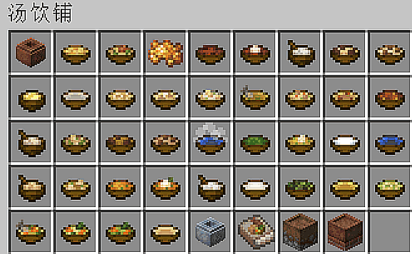 汤饮铺 (Thermopolium)这款模组添加了饮品与汤。该模组所有制作均没有配方限制,只有你的想象力限制。你可以自由地往汤里面加入原料,烹煮浓缩,加水稀释或是多种汤混合形成大杂烩。汤是用汤锅烹饪并且使用碗装得到的,汤会完全继承原料的属性(饱食度和饱和度等),同时保持了食品的效果和属性和加入药水的属性。