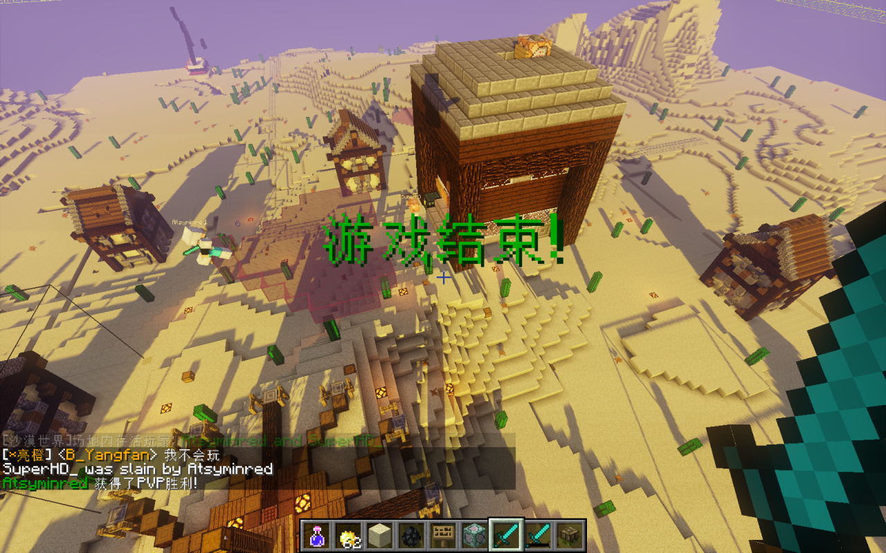 自动判定胜出玩家,使用testfor探测玩家数目结合非门即可,当玩家数少于2人会输出一个红石信号,激活结束程序